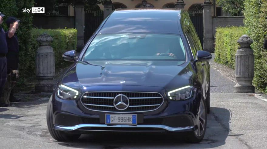 Il momento della partenza del feretro di Silvio Berlusconi dalla sua villa di Arcore, diretto verso il Duomo per i funerali.
