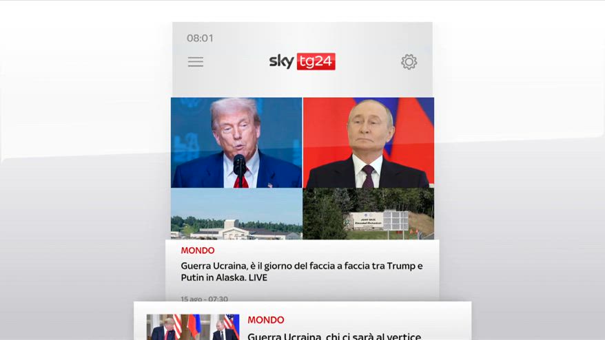 Oggi ad Anchorage in Alaska, il faccia a faccia tra Trump e Putin, sul tavolo l'offerta di terre rare a Mosca e garanzie di difesa a Kiev, ma fuori dalla NATO, lo speciale di Sky TG 24 dalle 21. Se va bene, necessario un incontro trilaterale con Zelensky, dice il presidente americano, lo Zar rompe il silenzio. Da Donald sforzi sinceri, Zelensky, il Cremlino faccia sul serio. Strage di migranti al largo di Lampedusa, la Guardia Costiera continua le ricerche dei dispersi, almeno 23 le vittime nel doppio naufragio, proseguono gli sbarchi sull'isola. Rapporto del Viminale su sicurezza e ordine pubblico, secondo i dati, reati in calo del 9%, ma non gli omicidi, in aumento del 15% il numero di femminicidi da partner o ex. Indagini sull'urbanistica a Milano, tornano liberi: l'ex assessore Tancredi, l'ex componente della commissione paesaggio Marinoni e il manager Pella, predisposte misure interdittive. La donna investita e uccisa a Milano, i tre bambini, tra cui il conducente dell'auto che ha travolto la 71enne sono stati portati in comunità protette, il quarto è ancora in fuga. Tennis a Cincinnati, Sinner conquista la semifinale battendo in due set Auger-Aliassime, Paolini vola ai quarti, stasera riparte la Premier League in esclusiva su Sky. Fabio Concato annuncia sui social di avere un tumore, mi sto curando con molta fiducia e sono tranquillo. L'artista milanese di 72 anni ha cancellato i tour estivi. .