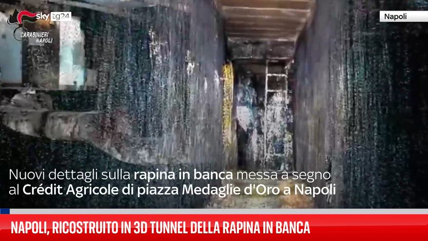 Nuovi dettagli sulla rapina in banca messa a segno il 16 aprile al Crédit Agricole di piazza Medaglie d'Oro di Napoli. I ladri hanno svaligiato decine di cassette di sicurezza dal caveau e poi sono fuggiti attraverso le fogne. In un video diffuso dai carabinieri, il geologo Gianluca Minin illustra la ricostruzione grafica 3D del cunicolo scavato sotto l'istituto di credito per realizzare il colpo.