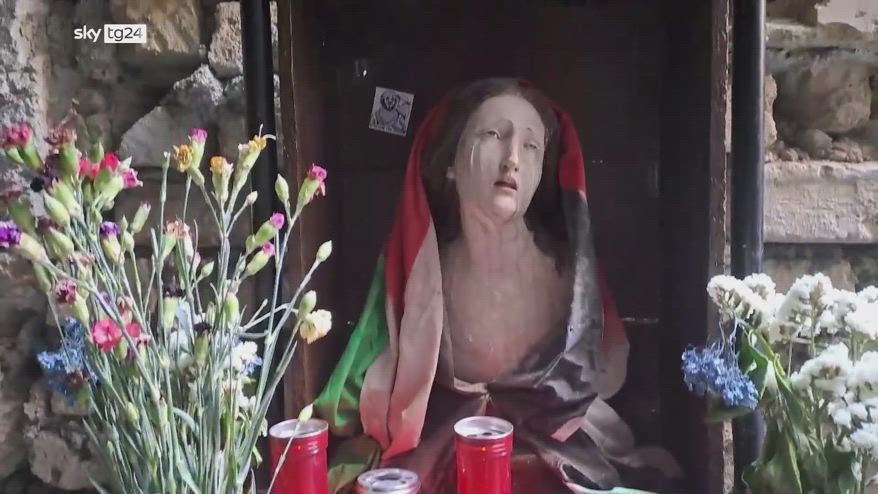 Nel centro storico di Napoli, in vico del Fico al Purgatorio, è apparsa una cappella votiva con una Madonna Addolorata raffigurata come donna palestinese, avvolta in una bandiera. L’opera anonima invita alla riflessione sulla tragedia di Gaza, con un messaggio rivolto ai fedeli: "Donate un fiore per i miei figli. I miei bambini sono uguali ai vostri" .