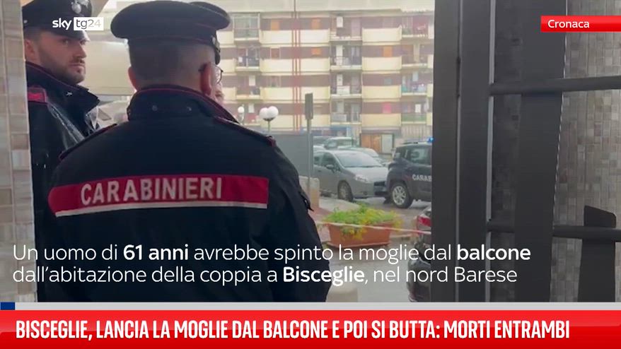 Tragedia a Bisceglie, nel nord Barese, dove un uomo di 61 anni avrebbe spinto la moglie dal balcone per poi gettarsi nel vuoto. Entrambi sono morti. Secondo le prime ricostruzioni, la coppia era in fase di separazione. Indagini in corso.
