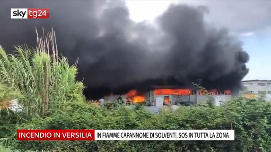 Pietrasanta, in fiamme capannone solventi. Video