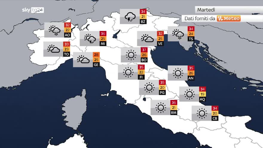 Ben ritrovati, continua sull'Italia questa fase siccitosa con assenza di precipitazioni ma, in settimana, è previsto qualche temporale in più specialmente sull'arco Alpino e Prealpino, con estensione fin su la Pianura Padana. Allora andiamo a vedere subito il dettaglio grazie alle nostre grafiche, lo facciamo iniziando dal centro-nord per quel che riguarda la giornata di Domenica ancora stabilità e bel tempo, con qualche temporale sull'arco Alpino e Prealpino, temperature in lieve calo fino a 34-35 gradi. Nella giornata di Lunedì si avvicina questa instabilità che porterà le prime piogge sulla Valle d'Aosta, sull'alta Lombardia e anche sul Trentino-Alto Adige, mentre Martedì qualche pioggia prevista anche in città della Pianura Padana come Lombardia e anche Veneto, Friuli-Venezia Giulia, Emilia Romagna e Piemonte, Valle d'Aosta ovviamente inclusa. Andiamo a vedere anche sulle aree in Sud Italia quel che succederà, sulle nostre due isole maggiori quindi stabilità, bel tempo che continua a portare temperature davvero estreme fino a 40 gradi, localmente anche superiori. Superiori alla media quasi ovunque di 5-6 gradi. Nella giornata di Lunedì ancora bel tempo, assenza totale di precipitazioni quindi qui la perturbazione purtroppo non arriverà per cui ci attendiamo solo ed esclusivamente bellissime giornate di sole. Continuate a seguirci sulla nostra app Il Meteo.it, grazie.
