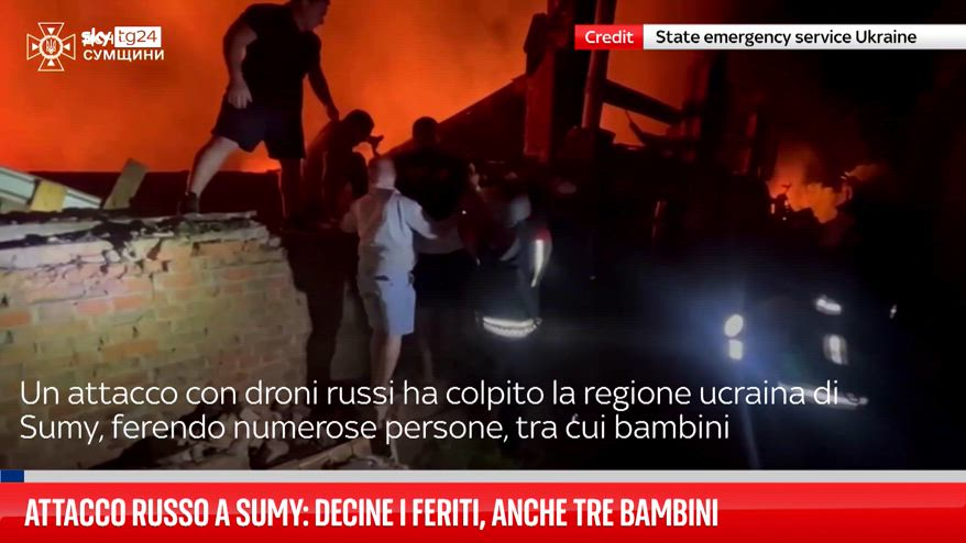 Nella notte del 20 agosto 2025 un attacco con droni russi ha colpito la regione ucraina di Sumy, ferendo numerose persone, tra cui una famiglia con tre bambini di 5 mesi, 4 e 6 anni. Le autorità locali parlano di 15 droni lanciati contro l’area di Okhtyrka. L’attacco arriva mentre si intensificano gli sforzi diplomatici per fermare la guerra. Nonostante le evidenze, Mosca nega di colpire civili o infrastrutture.