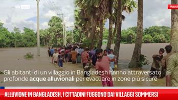 Gli abitanti di un villaggio in Bangladesh hanno attraversato profonde acque alluvionali per evacuare in zone più sicure, mentre le gravi inondazioni provocate dalle piogge monsoniche continuano a inondare parti della nazione dell'Asia meridionale.