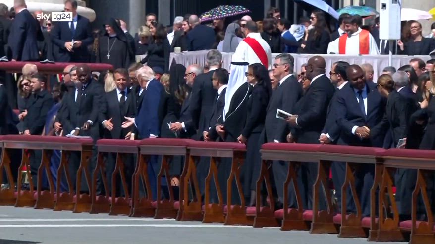 Funerali Francesco, stretta di mano Trump-Macron