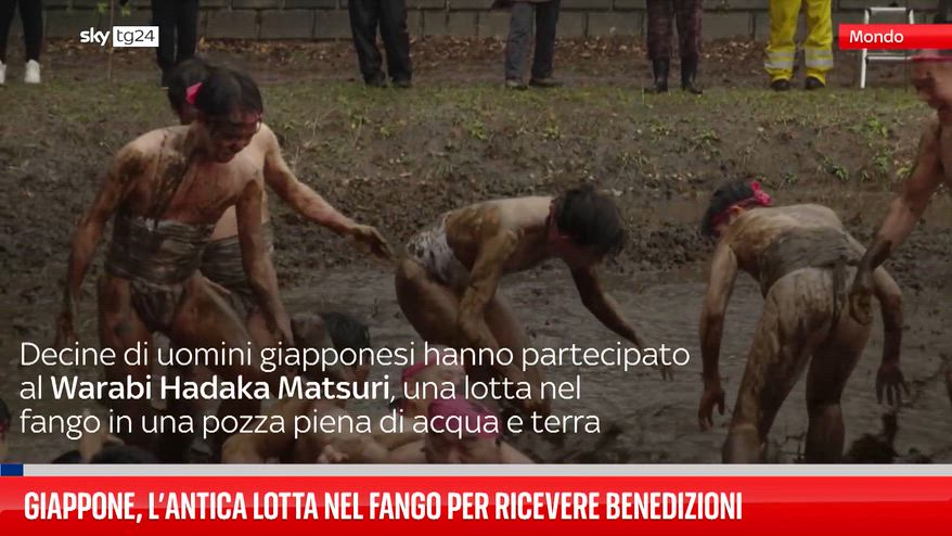 Decine di uomini giapponesi seminudi hanno partecipato al Warabi Hadaka Matsuri, una lotta nel fango in una pozza piena di acqua e terra.