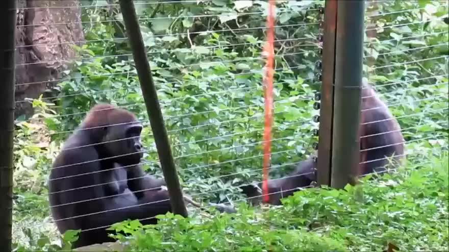 Gorilla usa bastone per sollevare la rete e prendere foglie