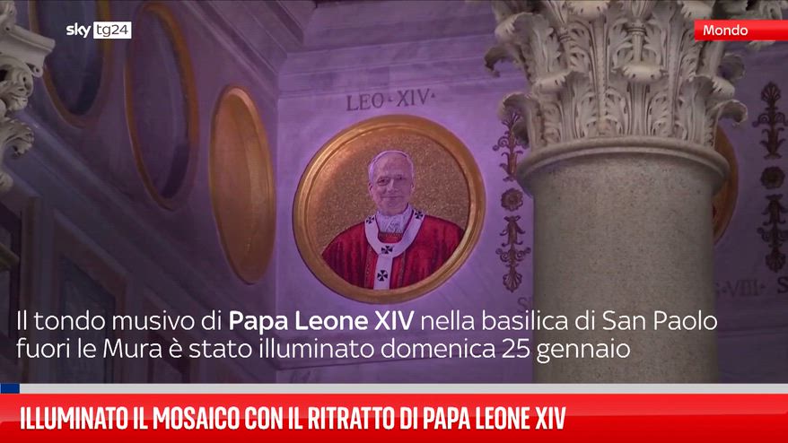 Il tondo musivo di Papa Leone XIV nella basilica di San Paolo fuori le Mura è stato illuminato in occasione della celebrazione dei Vespri per la solennità della conversione di San Paolo.