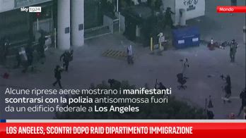 Alcune riprese aeree mostrano i manifestanti scontrarsi con la polizia antisommossa fuori da un edificio federale a Los Angeles.