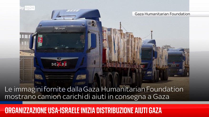 Le immagini fornite dalla Gaza Humanitarian Foundation mostrano camion carichi di aiuti in consegna a Gaza .