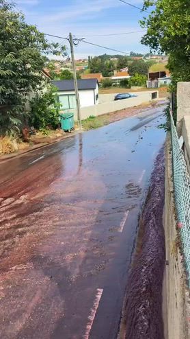 Un fiume di vino rosso ha invaso una strada a Levira, in Portogallo, dopo l'esplosione di due cisterne. La casa vinicola a cui appartenevano le cisterne si è scusata per l'accaduto e ha annunciato che si farà carico delle spese di pulizia delle strade. Non ci sono stati feriti. Credit: @pitstore223 via Storyful.
