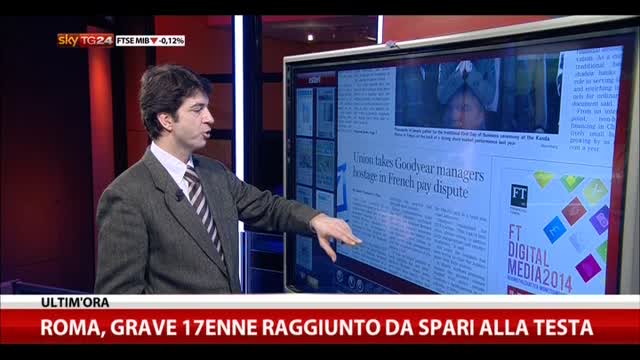 Sui giornali esteri torna il Boss-napping: protesta la Goodyear in Francia, l'infortunio della cancelliera tedesca obbligata al riposo per tre settimane.