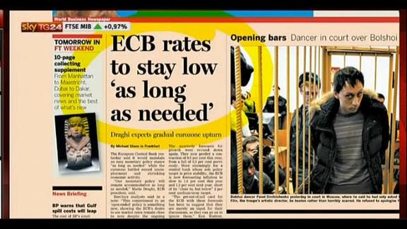 Sulle prima pagine dei quotidiani esteri, le dichiarazioni del presidente della BCE Mario Draghi sui tassi d'interesse.