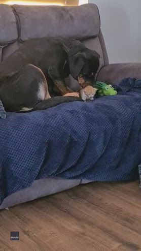 Rottweiler "adotta" un gattino. VIDEO