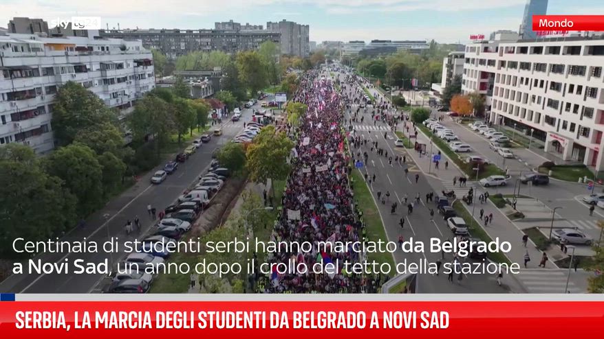 Centinaia di studenti serbi hanno marciato da Belgrado a Novi Sad, un anno dopo il crollo del tetto della stazione ferroviaria .