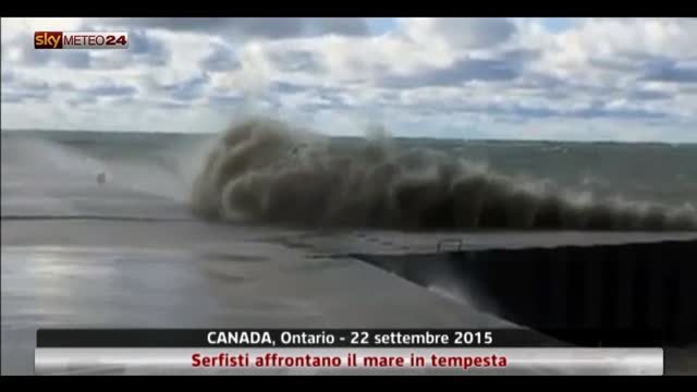 Ontario, surfisti sfidano il mare in tempesta