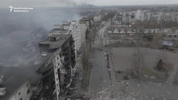 Dopo l'attacco delle forze russe in una località a nord ovest di Kiev in ucraina, restano edifici distrutti e detriti. Le immagini rilasciate da RFE/RL mostrano intere sezioni di edifici residenziali rasi al suolo. Credit: RFE/RL via Storyful.