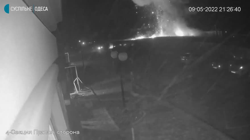 Una telecamera di sicurezza ha ripreso il momento in cui un missile russo ha colpito il centro commerciale Riviera a Odessa nella serata del 9 aggio. Una persona è morta nell'esplosione, mentre molte sono rimaste ferite. Si tratta di uno dei sette missili che hanno colpito Odessa quel giorno. Almeno 100 appartamenti che si trovavano nei pressi del centro commerciali sono stati distrutti. Secondo le autorità ucraine i russi hanno lanciato missili che risalivano all'epoca sovietica. Credit: Suspilne Odesa via Storyful.