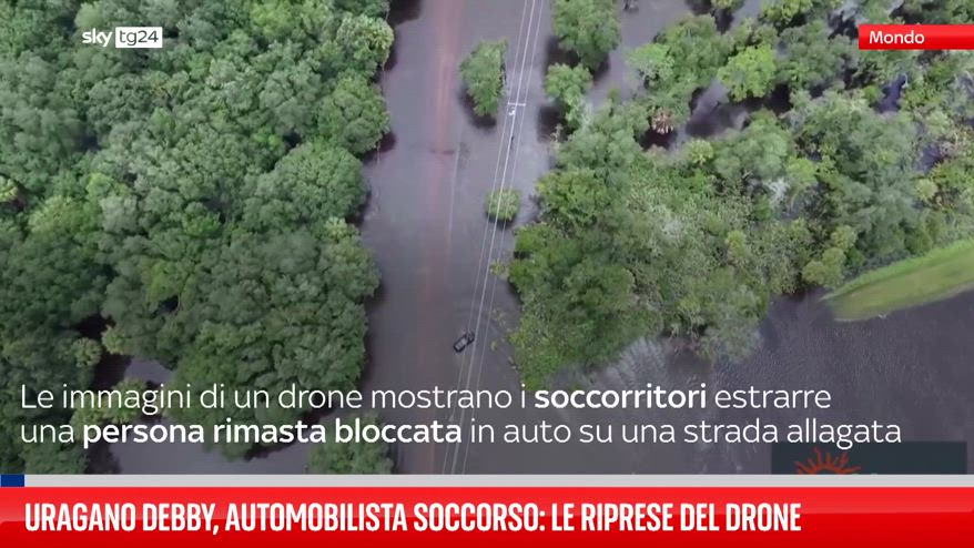 Un video girato con un drone mostra i soccorritori estrarre una persona rimasta bloccata in un veicolo su una strada allagata in Florida dopo il passaggio dell’uragano Debby.