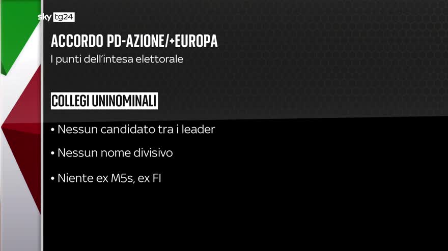Dopo giorni di attesa e botta e risposta l'accordo arriva. Enrico Letta e Carlo Calenda, e con loro Benedetto della Vedova, siglano l'intesa per affrontare insieme le elezioni del prossimo 25 settembre. Un'alleanza solida, capace di vincere, spiegano i leader. "Noi riteniamo che non sia immaginabile che il nostro Paese, dopo l'esperienza del governo Draghi, passi a un'esperienza del governo delle destre". "Senza un sistema comune di valori e proposte, un'alleanza, per quanto sia un patto elettorale, non esiste. Noi ci siamo impegnati molto affinché questo non fosse". I leader di PD, Azione e +Europa mettono nero su bianco quelli che sono i punti alla base della partnership elettorale e programmatica. La ripartizione dei collegi, quelli uninominali, il 70% ai democratici e progressisti, il PD innanzitutto, con Articolo Uno e socialisti, il 30% ad Azione e +Europa. Poi l'altra questione cruciale: niente leader nei collegi uninominali, niente ex parlamentari 5 Stelle, niente ex di Forza Italia. Gli esclusi potranno comunque essere candidati nei listini proporzionali. Quanto alla parte programmatica si va da una necessaria revisione del superbonus edilizio e del reddito di cittadinanza, al patto sull'energia, con la realizzazione di rigassificatori. Sul fronte economico sociale il salario minimo e il taglio del cuneo fiscale, la prosecuzione dell'agenda Draghi e di quelle riforme legate al Pnrr. E in politica estera le alleanze con i partner occidentali e atlantici e l'ancoraggio all'Europa. Resta ora la corsa in una campagna elettorale che sarà accesa ma prima il segretario PD dovrà risolvere altre possibili grane: i malumori per l'intesa raggiunta che inevitabilmente crescono negli altri partner dei Dem. Da impegno civico di Di Maio, con il quale Letta si è già incontrato alla Farnesina, seguiranno a faccia a faccia, e la sinistra di Fratoianni e i Verdi di Bonelli che chiedono chiarimenti. "Non abbiamo bisogno di diritti di tribuna, correremo perché siamo assolutamente convinti di ottenere un grosso risultato nella società". La verifica però ci sarà nelle prossime ore. I Dem si dicono fiduciosi, il quadro si va definendo. La corsa elettorale pure.
