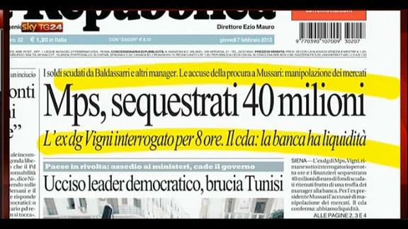Gli sviluppi dell'inchiesta Montepaschi, l'assassinio del leader democratico a Tunisi, Napolitano sulla drammatica situazione delle carceri.