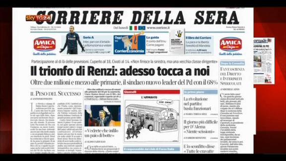 Il trionfo di Renzi alle Primarie del PD, che sfiora il 70% dei voti. Questa la notizia principale su tutte le prime pagine dei quotidiani nazionali.