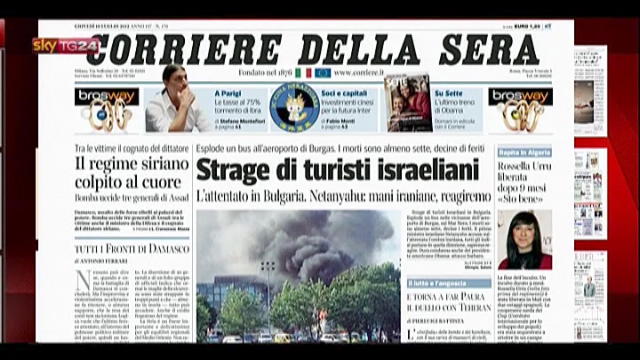 In primo piano sui quotidiani oggi in edicola: strage di turisti israeliani in Bulgaria, ancora Siria e la liberazione di Rossella Urru.