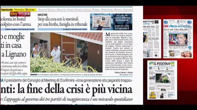 Le prime pagine dei giornali di oggi dedicano spazio al duplice omicidio dei coniugi di Lignano, per poi passare alle dichiarazioni di Monti sulla crisi.