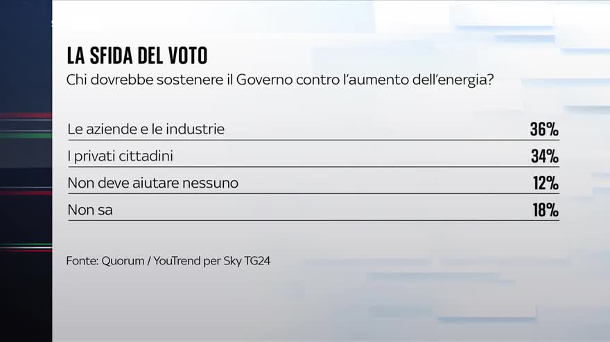 Allora crisi energetica, caro energia che preoccupa tutti gli italiani, vediamo allora nei numeri del nuovo sondaggio di QuorumYoutrend per Sky Tg24 con Jacopo Arbarello che ci mostra i risultati al digiwall. I dati del sondaggio Youtrend per quanto riguarda la crisi energetica fanno capire quanto preoccupi gli italiani, iniziamo cartello per cartello per capire cosa hanno chiesto a Youtrend agli italiani. L'Italia dovrebbe investire anche sul nucleare? Sappiamo che l'Italia ha bocciato il nucleare con un referendum, il 45% di chi ha risposto pensa di sì, è comunque diviso il nostro Paese perché il 37% risponde di no e il 18% non sa. Poi ancora, è stato giusto imporre le sanzioni a Mosca? Anche qua: una maggioranza che pensa di sì ma un paese diviso 43% di sì 37% di non sa. E poi, quanto la preoccupa un ulteriore aumento delle bollette di gas e luce? Qui il dato è colossale. Molto e abbastanza quotano il 90%, poco e per nulla il 7% probabilmente una fascia elevata a livello di reddito della popolazione non sa il 3%. E ancora: chi dovrebbe sostenere il Governo contro l'aumento dell'energia? Le aziende e le industrie è la prima risposta 36% i privati cittadini il 34, non deve aiutare nessuno cioè il liberalismo massimo, al 12%. Ancora: qual è la possibile azione del Governo più efficace per far fronte alla crisi energetica? Destinare denaro pubblico per bloccare l'aumento del costo dell'elettricità al 28%, investire in rigassificatori come quello di Piombino 26%, cessare le ostilità con la Russia e riprendere gli approvvigionamenti al 22%. Ovviamente non è una cosa che è nell'arco delle possibilità del Governo cessare le ostilità. Razionare l'accesso all'elettricità e al gas 11%. I comportamenti personali: ha iniziato o intende iniziare ad adottare questi comportamenti? Ovviamente qui se ne possono adottare più d'uno. La quota non fa 100. Usare lampadine a LED 82%, abbassare il riscaldamento in casa 76%, in futuro ovviamente, usare il programma Eco sulla lavatrice 73%, abbassare la temperatura dell'acqua quando fa il bagno 72%. E poi ancora: sulle abitudini degli italiani: staccare la spina agli elettrodomestici in stand-by, ridurre gli spostamenti in automobile 68 e 67%. Usare meno aria condizionata 61%; dobbiamo vederli gli italiani che le usano poco quando fa caldo, investire sull'efficienza energetica domestica 53%. Per chiudere, andiamo a vedere il giudizio sul Governo Draghi: molto e abbastanza positivo al 57% che è un dato molto alto, molto negativo 36%. Sulla politica in generale, quanta fiducia nella classe politica? Molto e abbastanza 19%, poca in nessuna 77%.