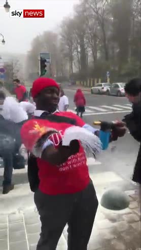 Among the protest near to the Brexit summit in Brussels, one campaigner is seen burning a 'mocked up version' of Theresa May's Brexit deal.