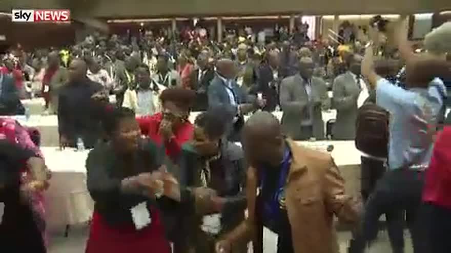 Members of Zimbabwe's ruling ZANU-PF party dance as they celebrate the dismissal of its long-standing leader Robert Mugabe.