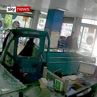 A dog accidentally in China drives a small vehicle through a shop window after presumably stepping on the peddles.