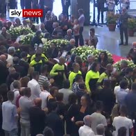 Firefighters arrive to pay their respects to the victims of the Morandi Bridge collapse, before the state funeral starts.
