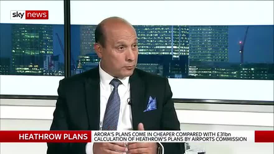 Chairman and founder of Arora, Surinder Arora, explains to Sky's Ian King his group's alternative plan for a third runway at Heathrow, which claims to cut the cost of Heathrow's own proposals by half the Airport Commission's estimates.