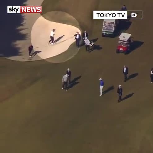 Video shows Japanese Prime Minister apparently falling into a bunker while playing golf with Donald Trump.