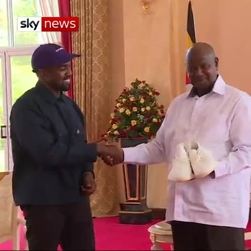 President Yoweri Museveni beamed with delight as superstars Kanye West and Kim Kardashian West signed his new sneakers, a present from the rapper.