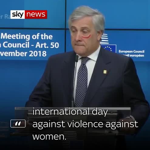 The head of the European Parliament drew a red mark on his face in protest at violence against women during a news conference.