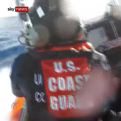 Dramatic footage shows US Coast Guard team approaching a suspected drug smuggling vessel in international waters of Pacific Ocean off California coast.