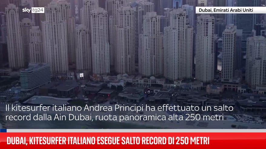 Il kitesurfer italiano Andrea Principi ha effettuato un salto record dalla cima di Ain Dubai, la ruota panoramica più alta al mondo con i suoi 250 metri. Il 21enne si è lanciato dall’osservatorio planando per circa un minuto prima di atterrare nelle acque al largo di Jumeirah Beach. Durante la discesa ha eseguito sei manovre consecutive “Around the World”, una prima mondiale per questa tecnica. Per l’impresa ha trasformato il kite in una sorta di paracadute, toccando l’acqua del Golfo Persico in modo controllato.