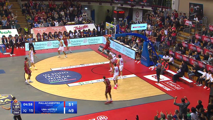 Momento spettacolare nel 3° quarto della sfida tra Trieste e Reggio Emilia. I padroni di casa, un po' in difficoltà nel primo tempo, riescono finalmente a correre e Colby Ross alza l'alley-oop che porta alla schiacciata al volo di Juan Toscano-Anderson che fa esultare il pubblico sugli spalti.