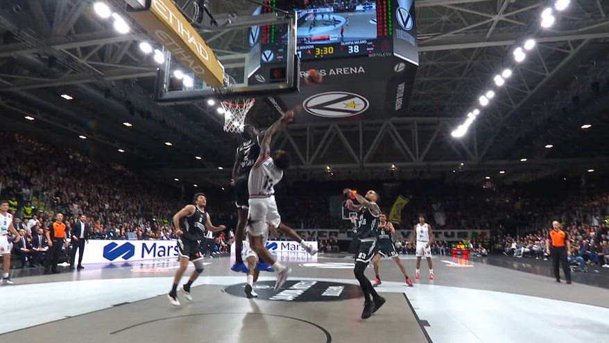 Dopo essere andati sotto anche di 15 lunghezze nel corso del primo tempo, a dare il via alla rimonta della Virtus Bologna è stata anche una super stoppata di Saliou Niang, capace di volare in cielo per cancellare una conclusione di Armoni Brooks nel derby italiano di Eurolega contro l'Olimpia Milano. È la giocata più spettacolare di un parziale da 16-1 per i padroni di casa, riaccendendo anche la Virtus Arena.