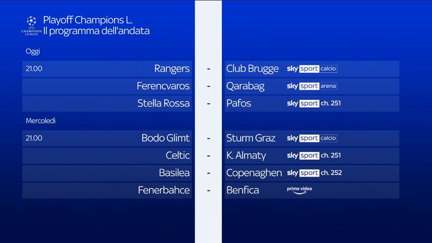 Il programma dei playoff di andata di Champions League: stasera le prime tre sfide e domani altre quattro. Tutto sui canali Sky Sport.