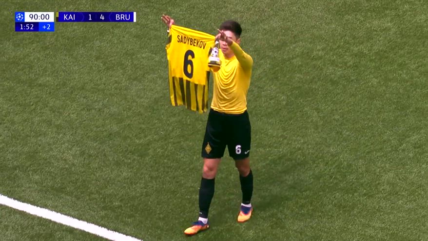 Sembrerebbe un caso di mitomania, ma dietro all'esultanza del centrocampista Adilet Sadybekov si cela un momento storico: il primo gol di sempre in casa del Kairat Almaty in Champions League. Poco importa, quindi, se era soltanto la rete che ha cambiato il punteggio da 0-4 a 1-4 al secondo minuto di recupero. L'esultanza con la maglietta è un copia-incolla delle famose gesta di Messi e Cristiano Ronaldo che, nei loro grandi duelli nei Clásico di Spagna, avevano celebrato la rispettive reti mostrando, appunto, la maglietta col loro nome in faccia ai tifosi rivali .