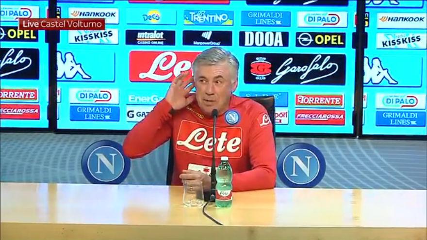 Ancelotti fa il gesto dell'orecchio in conferenza