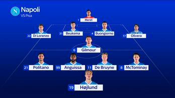 Napoli-Pisa chiude la 4^ giornata di Serie A. Conte verso la conferma del 4-1-4-1 con Gilmour al posto di Lobotka e Politano, Anguissa, De Bruyne e McTominay dietro Hojlund. Olivera è favorito su Spinazzola. Match in diretta alle 20.45 su Sky Sport Calcio, Sky Sport Uno, Sky Sport 4K, Sky Sport 251 e in streaming su NOW.