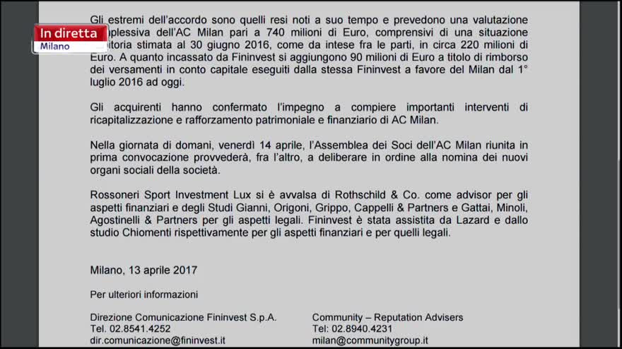 Comunicato Fininvest, Milan ufficialmente venduto