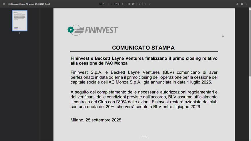 È ufficiale: il Monza è americano. Fininvest e Beckett Layne Ventures hanno perfezionato il primo closing dell'operazione, con il fondo statunitense che ha assunto il controllo del club con l'80% delle azioni. Il restante 20% al momento resta a Fininvest, che lo cederà sempre a BLV entro giugno 2026.
