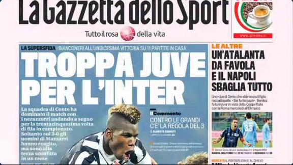 Tutte le prime pagine dei quotidiani sportivi sono dedicate alla vittoria della Juve contro l'Inter e alla caduta del Napoli contro l'Atalanta.