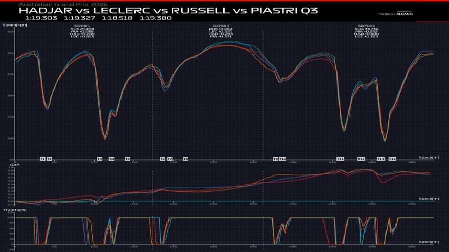 Abbiamo analizzato i dati dei quattro top team Red Bull, Mercedes, Ferrari e McLaren. La differenza è abissale in tutte le punte di velocità, ma soprattutto laddove c'è una crisi energetica per tutti. Quindi tutto il tratto che va dalla sette alla nove che è il tratto più complicato. Assoluto per la gestione energetica, ma anche quello successivo, quello che va poi dalla 10 alla 11. Lì la Mercedes 'devasta' gli avversari. Guarda il VIDEO.